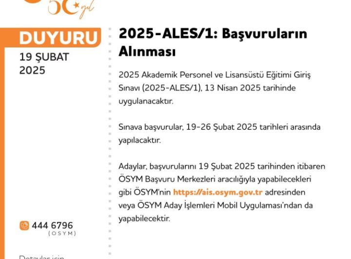 13 Nisan’da yapılacak 2025-ALES/1 için son başvurular 26 Şubat’a kadar alınacak. ANKARA (İGFA) – ÖSYM, 2025 Akademik...