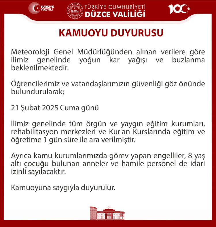 Sefer DEMİR / DÜZCE (İGFA) – Düzce Valisi Selçuk Aslan, meteorolojik veriler ve olumsuz hava koşullarının devam etmesi dolayısıyla Düzce genelinde tüm okullar, özel eğitim kurumları, Kur’an kursları ve rehabilitasyon merkezlerinde 21 Şubat Cuma günü eğitime 1 gün ara verildiğini açıkladı.
