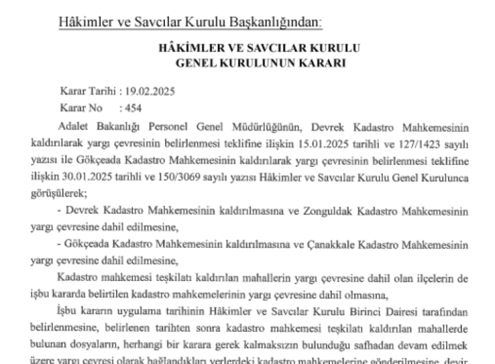HSK kararına göre Devrek ve Gökçeada Kadastro mahkemeleri kaldırıldı. ANKARA (İGFA) – Resmi Gazete’de yayımlanan Hakimler ve...