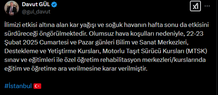 Vali Gül, yaptığı yazılı açıklamada, İstanbul’u etkisi altına alan kar yağışı ve soğuk havanın hafta sonu da etkisini sürdüreceği öngörüldüğünden dolayı, olumsuz hava koşulları nedeniyle, 22-23 Şubat 2025 Cumartesi ve Pazar günleri Bilim ve Sanat Merkezleri, Destekleme ve Yetiştirme Kursları, Motorlu Taşıt Sürücü Kursları (MTSK) sınav ve eğitimleri ile özel öğretim rehabilitasyon merkezleri/kurslarında eğitim ve öğretime ara verilmesinin kararlaştırıldığını duyurdu.