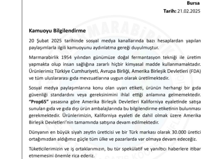 Marmarabirlik’in ABD’de satılan ürünlerinde yer alan ‘kanser uyarısı’ etiketi ile ilgili iddiaların sosyal medyada yayılması üzerine açıklama...