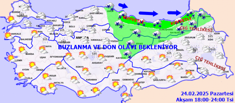 Meteorolojik uyarılara göre de; kuzey, iç ve doğu kesimlerde kuvvetli olmak üzere Türkiye genelinde buzlanma ve don ile sis ve pus olayı bekleniyor.