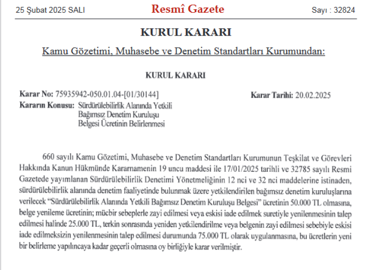 Buna göre sürdürülebilirlik alanında denetim faaliyetinde bulunmak üzere yetkilendirilen bağımsız denetim kuruluşlarına verilecek belge ücretinin 50 bin TL olması kararlaştırıldı.