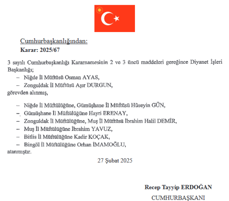 İl Müftüleri kararnamesine göre Niğde İl Müftüsü Osman Ayas ile Zonguldak İl Müftüsü Aşır Durgun görevlerinden alındı.