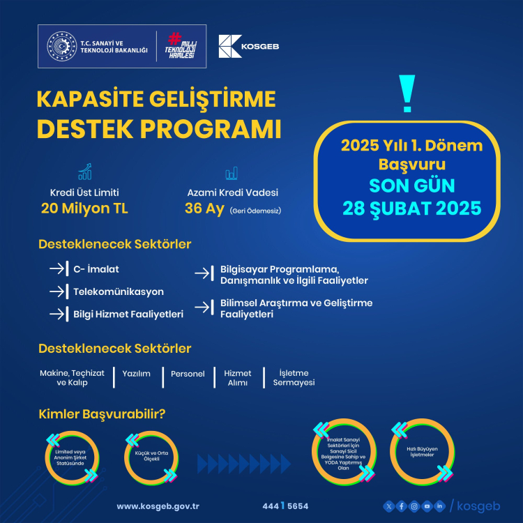 KOSGEB tarafından yürütülen Kapasite Geliştirme Destek Programı, özellikle imalat, telekomünikasyon, bilgi teknolojileri ve Ar-Ge sektörlerinde faaliyet gösteren firmalar için 36 ay geri ödemesiz kredi faiz desteği sunuyor.