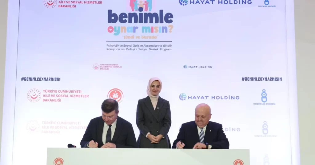 Konuşmaların ardından Engelli ve Yaşlı Hizmetleri Genel Müdürü Dr. Yasin Akar ve Hayat Holding Genel Sekreteri Osman Aksoy ‘Benimle Oynar Mısın?’ Psikolojik ve Sosyal Gelişim Aksamalarına Yönelik Koruyucu ve Önleyici Sosyal Destek Programı’nın protokolünü imzaladı.
