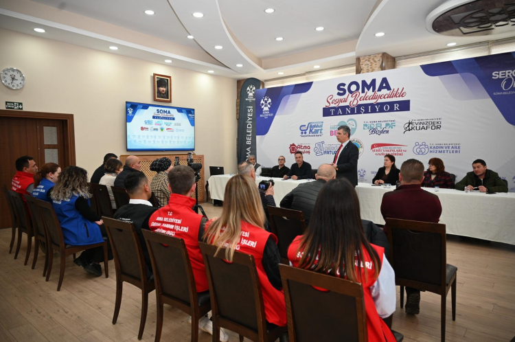 MANİSA (İGFA) – Soma Belediye Başkanı Sercan Okur’un öncülüğünde gerçekleşen Sosyal Belediyecilik ve Bakkal Kart Tanıtım Toplantısı, basın mensupları ve encümen üyelerinin katılımıyla geniş kapsamlı bir sunuma ev sahipliği yaptı. Toplantıda, Soma Belediyesi’nin yürüttüğü Bakkal Kart, Hoşgeldin Bebek, Askıda Fatura, Engelsiz Masa, Kadın ve Aile Hizmetleri, Şehit Yakınları ve Gaziler Birimi gibi birçok sosyal destek projesi tanıtıldı. Başkan Sercan Okur, Soma’nın artık yalnızca altyapı ve hizmet projeleriyle değil, sosyal belediyeciliğin güçlü bir örneği olarak da anılacağını vurguladı.