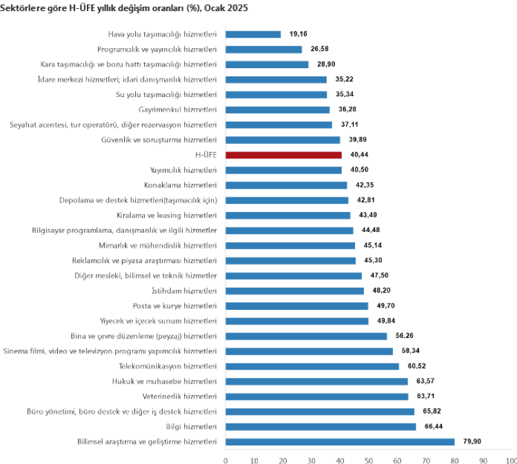 Bir önceki yılın aynı ayına göre, mesleki, bilimsel ve teknik hizmetlerde yüzde 51,73 artış, bilgi ve iletişim hizmetlerinde yüzde 49,96 artış, idari ve destek hizmetleri ise yüzde 48,45 artış oldu.