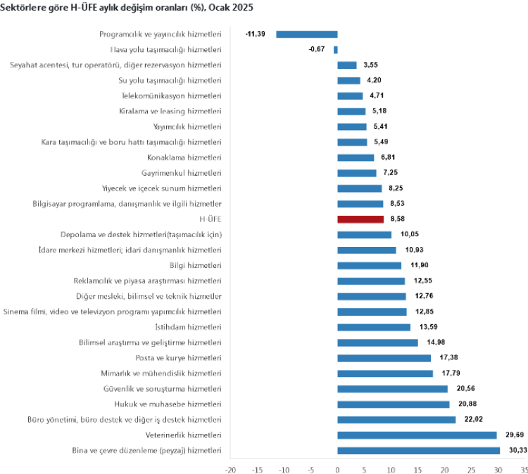 H-ÜFE 2025 yılı Ocak ayında bir önceki aya göre yüzde 8,58 artış, bir önceki yılın Aralık ayına göre yüzde 8,58 artış, bir önceki yılın aynı ayına göre yüzde 40,44 artış ve on iki aylık ortalamalara göre yüzde 63,25 artış gösterdi.