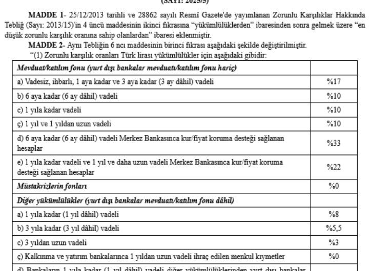 Merkez Bankası zorunlu karşılıklar hakkında değişiklik yaptı. Yurtdışı repo, kredi ve katılım fonu zorunlu karşılık oranı yüzde...