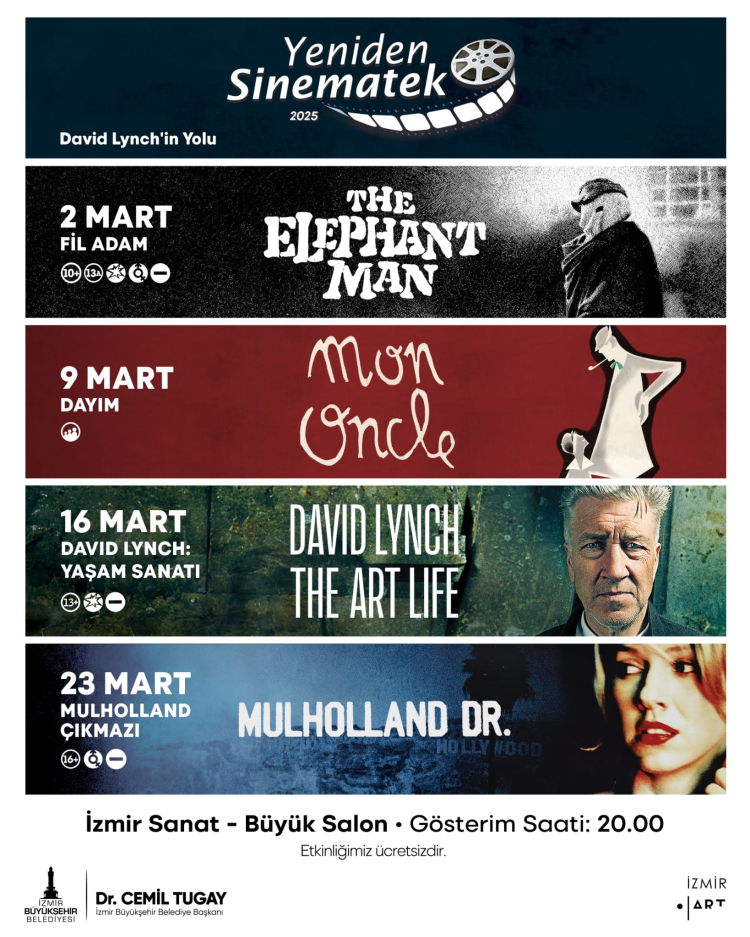 Film gösterimleri 2 Mart Pazar günü The Elephant Man (Fil Adam) ile İzmir Sanat Büyük Salon’da başlayacak. 9 Mart Pazar günü Mon Oncle (Dayım), 16 Mart Pazar günü David Lynch: The Art Life (David Lynch: Yaşam Sanatı) ve 23 Mart Pazar günü ise Mulholland Dr. (Mulholland Çıkmazı) İzmir Sanat Büyük Salon’da saat 20.00’de gösterilecek.