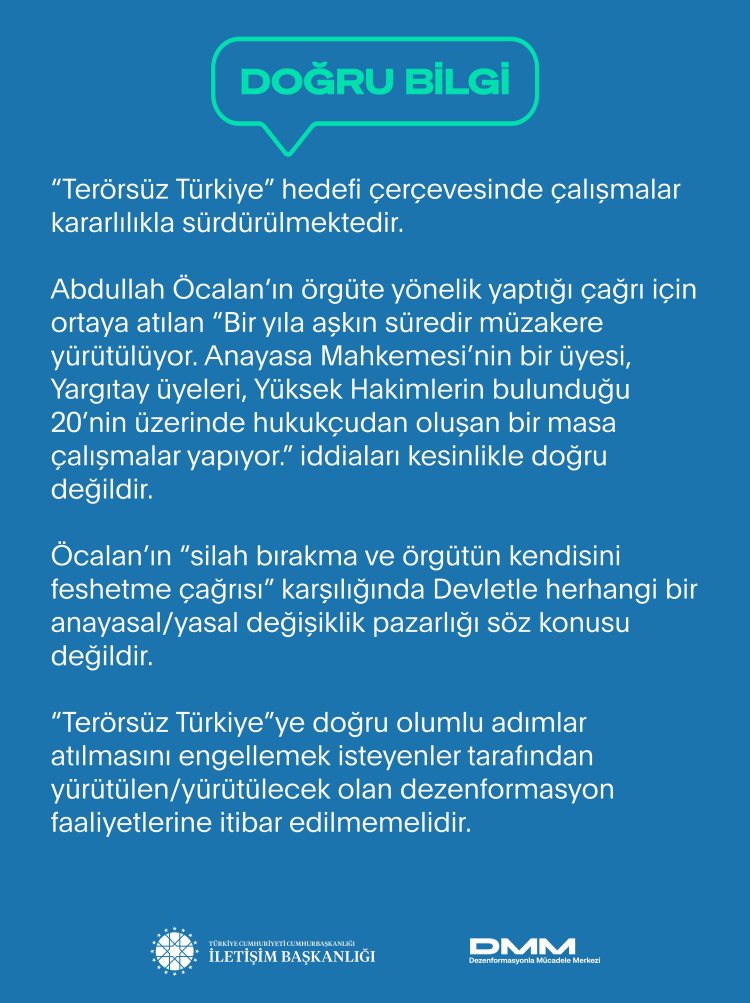 Dezenformasyonla Mücadele Merkezi’nden yapılan açıklamada, İmralı’dan örgüte yönelik yapılan çağrı için ortaya atılan “Bir yıla aşkın süredir müzakere yürütülüyor. Anayasa Mahkemesi’nin bir üyesi, Yargıtay üyeleri, Yüksek Hakimlerin bulunduğu 20’nin üzerinde hukukçudan oluşan bir masa çalışmalar yapıyor.” iddialarının kesinlikle doğru olmadığının altı çizildi.