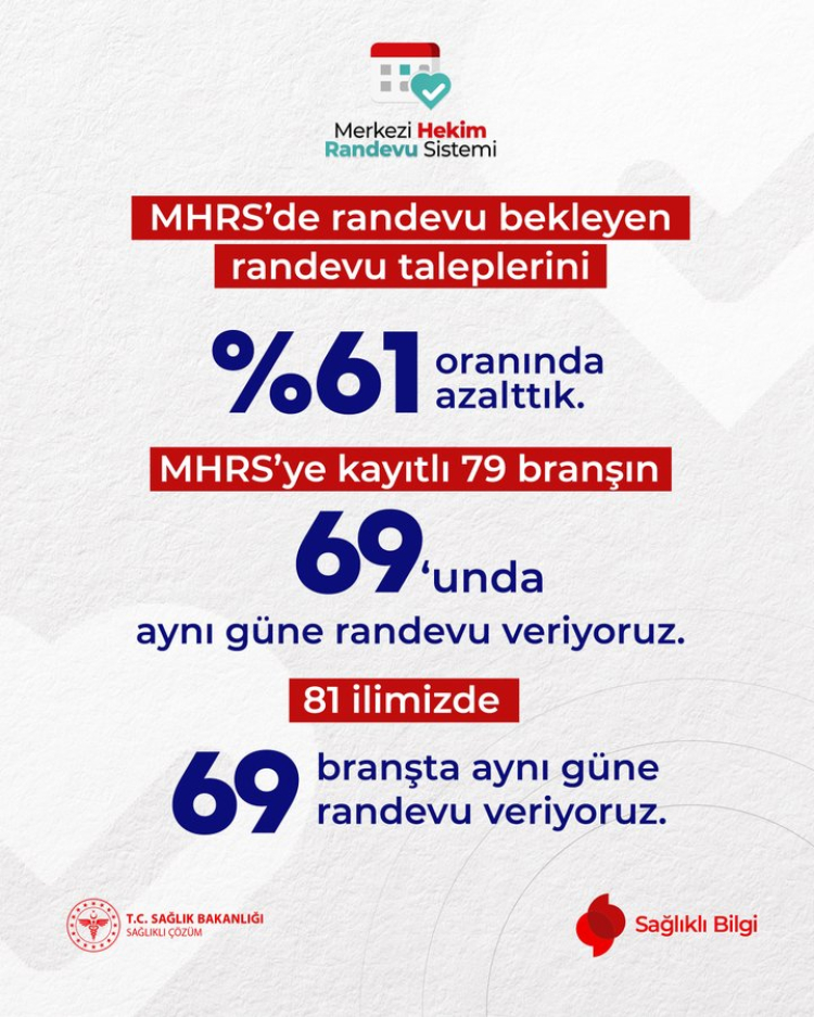 Sağlık Bakanlığı’ndan yapılan açıklamada, MHRS hizmeti verilen 79 branşın 69’unda AYNI GÜNE randevu verilebildiğinin altı çizilirken, “69 ilimizde ise aynı günde TÜM BRANŞLARDA randevu talebini karşılayabiliyoruz. Vatandaşlarımızın doğru basamaklarda etkin tedavi almaları ve takiplerinin en iyi şekilde yapılması için çalışmaya devam ediyoruz” denildi.