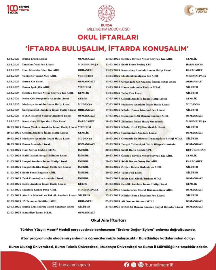 BURSA (İGFA) – Bursa İl Millî Eğitim Müdürlüğü’nden Ramazan ayında “İftarda Buluşalım, İftarda Konuşalım” söyleşileri başlatıyor.