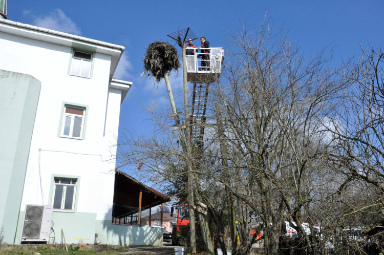 Rüzgârın etkisiyle yan yatan direk, yerinden sökülüp sağlam bir şekilde yeniden monte edildi. Ayrıca direğin üzerine kurulu olan leylek yuvası da dikkatle yerinden alındı. Eski yuvadaki dal parçaları temizlenerek, yeni yuva özenle yerine yerleştirildi. Onarım ve temizlik çalışmalarının ardından leylek yuvası yeniden kullanıma sunuldu. Yuvasına konan leylekler, yaşam alanlarına yerleşti.