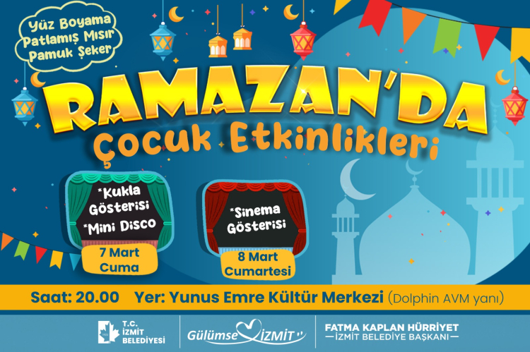 Ramazan ayının manevi atmosferini kültürel ve eğlenceli etkinliklerle destekleyen İzmit Belediyesi, çocukların bu özel dönemi neşe içinde geçirmesi için her hafta farklı etkinlikler sunacak. Etkinlikler ilk olarak 7 Mart Cuma günü 20.00’de kukla gösterisi ile mini disco ve 8 Mart Cumartesi günü sinema etkinliği ile başlayacak. İzmit Belediyesi ücretsiz olarak gerçekleştirilecek etkinliklere tüm çocukları ve ailelerini davet ediyor.