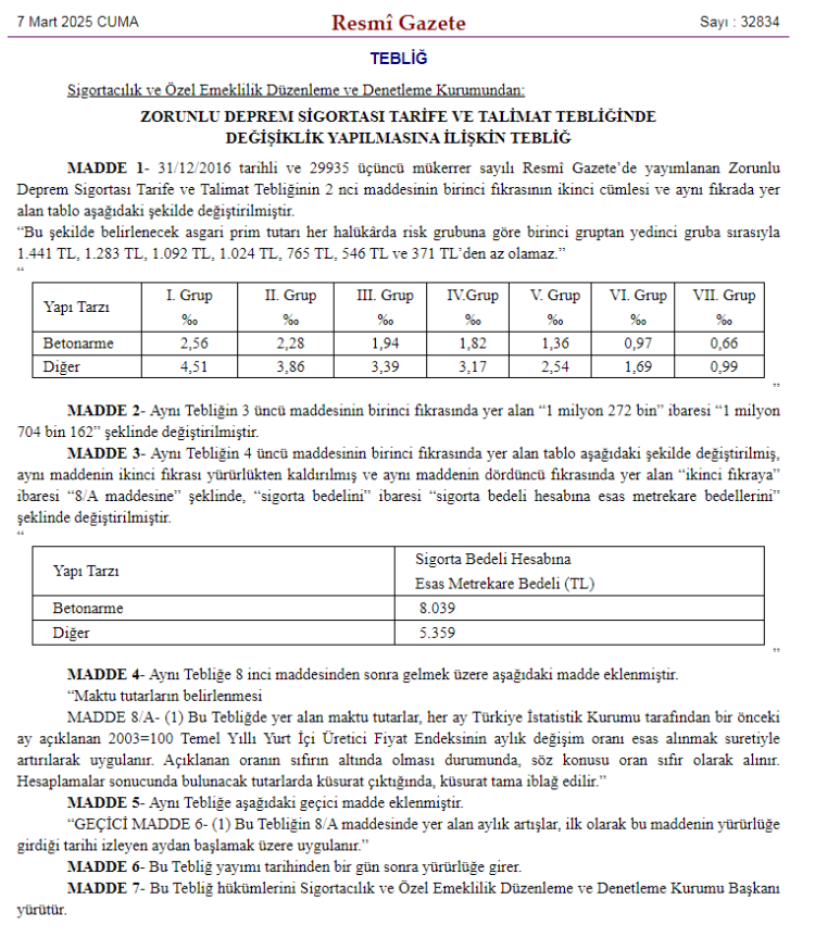 Buna göre; 31 Aralık 2016 tarihli ve 29935 üçüncü mükerrer sayılı Resmî Gazete’de yayımlanan Zorunlu Deprem Sigortası Tarife ve Talimat Tebliğinde yer alan,75 TL, 65 TL, 55 TL, 45 TL ve 35 TL zorunlu deprem sigortası asgari pirim tutarları 1.441 TL, 1.283 TL, 1.092 TL, 1.024 TL, 765 TL, 546 TL ve 371 TL’den az olamaz.” şeklinde değiştirildi.