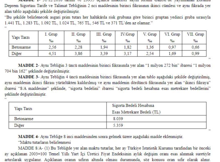 ANKARA (İGFA) – Zorunlu Deprem Sigortası Tarife ve Talimat Tebliğinde Değişiklik Yapılmasına İlişkin Tebliğ bugünkü Resmi Gazetede...
