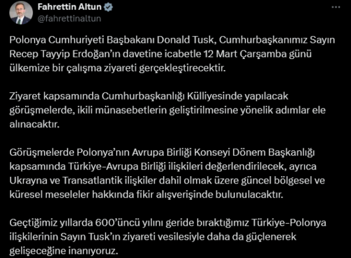 ANKARA (İGFA) – Polonya Cumhuriyeti Başbakanı Donald Tusk’ın, 12 Mart Çarşamba günü Türkiye’ye yapacağı ziyareti İletişim Başkanı...