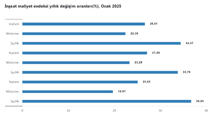 İnşaat maliyet endeksi, 2025 yılı Ocak ayında bir önceki aya göre yüzde 9,10 arttı, bir önceki yılın aynı ayına göre yüzde 26,61 arttı. Bir önceki aya göre malzeme endeksi yüzde 1,96 arttı, işçilik endeksi yüzde 23,58 arttı. Ayrıca bir önceki yılın aynı ayına göre malzeme endeksi yüzde 22,39 arttı, işçilik endeksi yüzde 34,37 arttı.