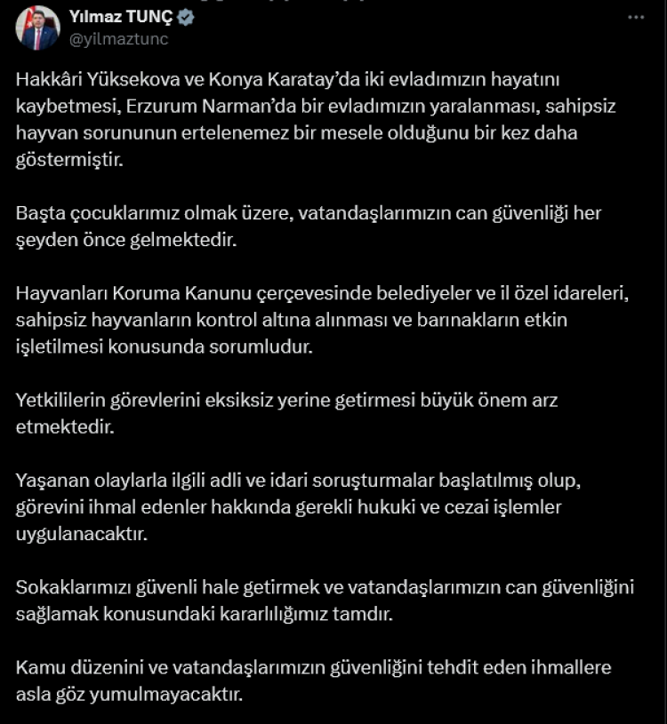 Konuyla ilgili sosyal medya hesabından paylaşımda bulunan Bakan Tunç, Hayvanları Koruma Kanunu çerçevesinde belediyeler ve il özel idareleri, sahipsiz hayvanların kontrol altına alınması ve barınakların etkin işletilmesi konusunda sorumlu olduğunun bir kez daha altını çizdi.