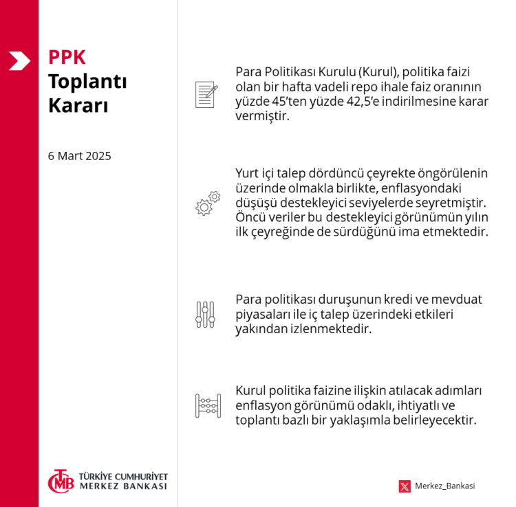 6 Mart toplantısına ilişkin 28 maddeden oluşan kurul özetini paylaşan Merkez Bankası, son dönem kredi büyümesi gelişmeleri göz önünde bulundurularak, makro finansal istikrarı korumak ve sıkı parasal duruşu desteklemek amacıyla ek adımlar atıldığını kaydetti.