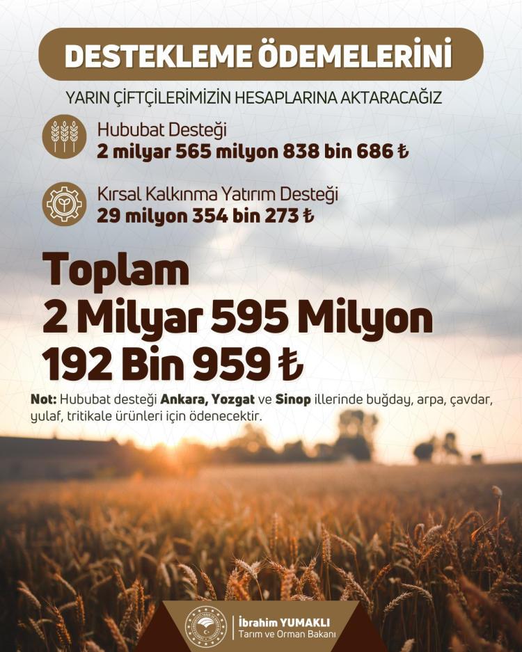 Hububat desteği için 2 milyar 565 milyon 838 bin 686 TL, kırsal kalkınma yatırım desteği için 29 milyon 354 bin 273 TL olarak gerçekleşecek ödemelerle ilgili yapılan duyuruda, hububat desteğinin Ankara, Yozgat ve Sinop illerinde buğday, arpa, çavdar, yulaf, trikale ürünleri için ödeneceği dipnot olarak düşüldü.