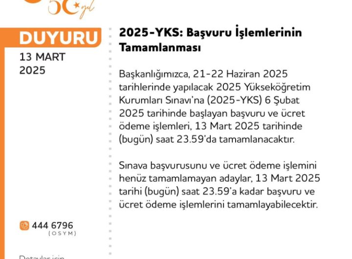 ANKARA (İGFA) – 2025-YKS için başvuru işlemlerinde son gün dolayısıyla ÖSYM’den yazılı açıklama yapıldı. 21-22 Haziran’da yapılacak...