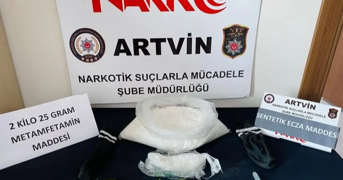 Araçta yapılan aramada, 2 kilo 25 gram metamfetamin, 3 adet sentetik uyuşturucu, 1 adet uyuşturucu kullanma aparatı ele geçirildi.