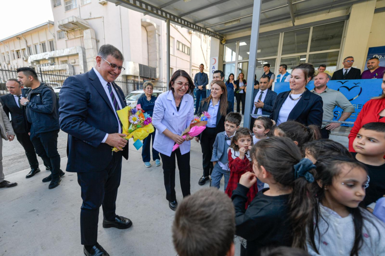 Ziyarette hastanenin en kıdemli üç hekimi Dr. İbrahim Kıyıcı, Dr. Melda Ongun Uçar ve Dr. Hüseyin Çetinel’e Başkan Tugay tarafından çiçek takdim edilerek, tüm çalışanlara karanfil dağıtıldı.
