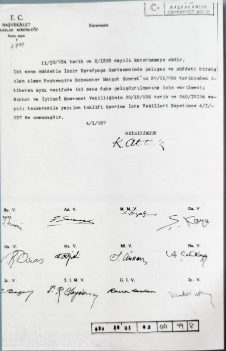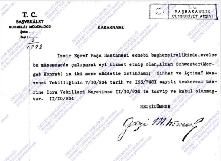 İki sene boyunca Eşrefpaşa Hastanesi’nde görev alan Alman hemşire Margot Konrat’ın çalışma izninin uzatılmasına ilişkin 1934 ve 1937 tarihli ve dönemin Cumhurbaşkanı Mustafa Kemal Atatürk imzalı iki belge, Başkan Tugay’a takdim edildi.