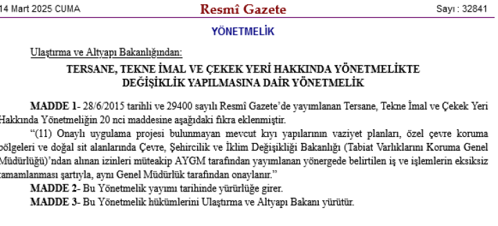 ANKARA (İGFA) – Ulaştırma ve Altyapı Bakanlığı, Tersane, Tekne İmal ve Çekek Yeri Hakkındaki Yönetmelikte değişikliğe gitti....