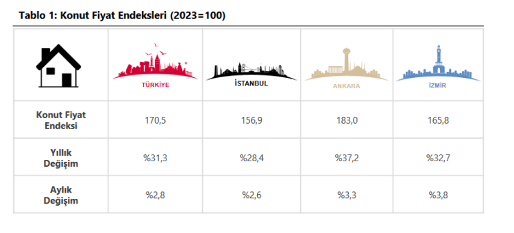 İstanbul, Ankara ve İzmir’in konut fiyat endekslerindeki gelişmeler değerlendirildiğinde, 2025 yılı Şubat ayında bir önceki aya göre, sırasıyla yüzde 2,6, 3,3 ve 3,8 oranlarında artış gözlenirken, endeks değerleri bir önceki yılın aynı ayına göre, İstanbul, Ankara ve İzmir’de sırasıyla yüzde 28,4, 37,2 ve 32,7 oranlarında artış gösterdiği kaydedildi.