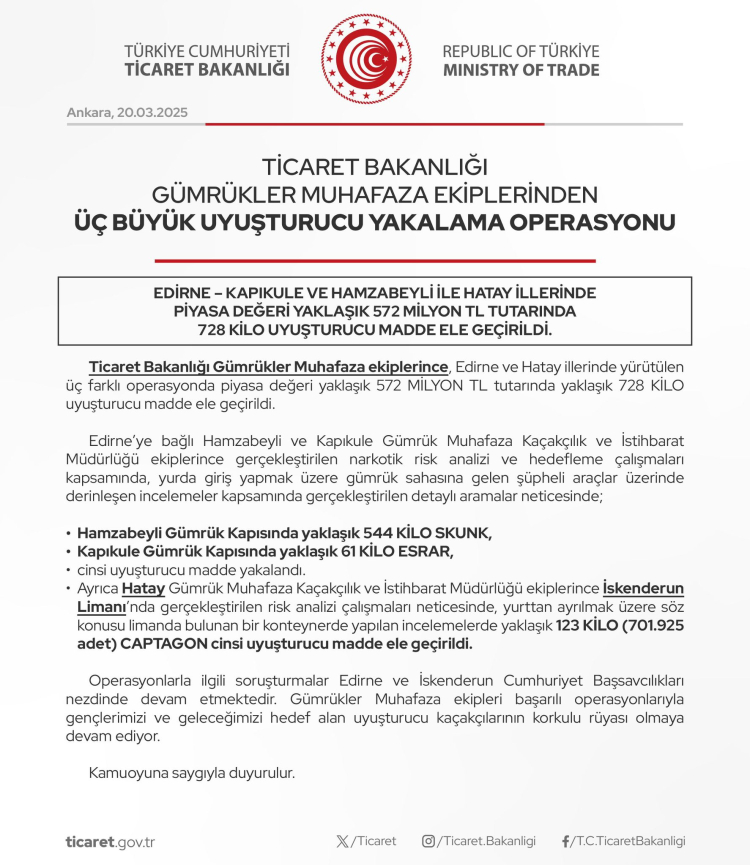 ANKARA (İGFA) – Ticaret Bakanlığı Gümrükler Muhafaza Ekiplerinin Üç Büyük Uyuşturucu Yakalama Operasyonu’na ilişkin ayrıntıları paylaştı.