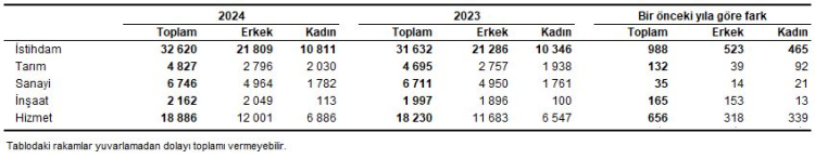2024 yılında 4 milyon 827 bin kişi tarım sektöründe, 6 milyon 746 bin kişi sanayi sektöründe, 2 milyon 162 bin kişi inşaat sektöründe, 18 milyon 886 bin kişi hizmet sektöründe istihdam edildi. Bir önceki yıl ile karşılaştırıldığında istihdam edilenlerin sayısı tarım sektöründe 132 bin, sanayi sektöründe 35 bin, inşaat sektöründe 165 bin, hizmet sektöründe 656 bin kişi arttı.