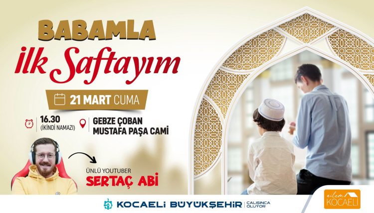 Kadın ve Aile Hizmetleri Şube Müdürlüğü tarafından yürütülen “Ailem Kocaeli Projesi” kapsamında gerçekleştirilen “Babamla İlk Saftayım” etkinliği 21 Mart Cuma (yarın) günü Gebze Çoban Mustafa Paşa Camii’nde saat 16.30’da (ikindi namazı) başlayacak.