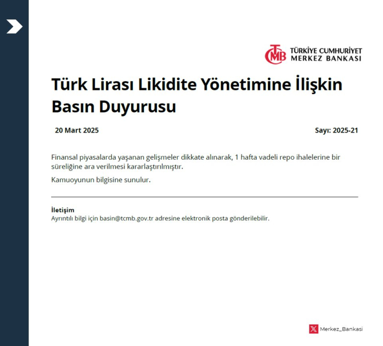 Bankadan yapılan duyuruda, “Finansal piyasalarda yaşanan gelişmeler dikkate alınarak, 1 hafta vadeli repo ihalelerine bir süreliğine ara verilmesi kararlaştırılmıştır.” denildi.