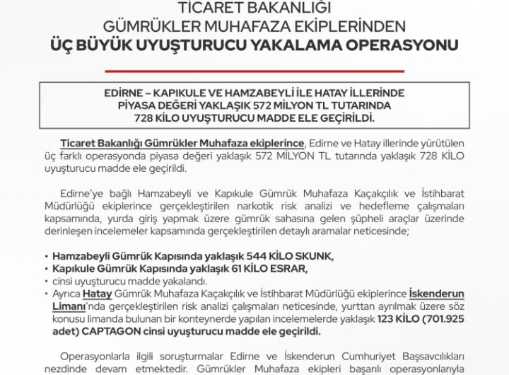 ANKARA (İGFA) – Ticaret Bakanlığı Gümrükler Muhafaza Ekiplerinin Üç Büyük Uyuşturucu Yakalama Operasyonu’na ilişkin ayrıntıları paylaştı. Edirne’ye...