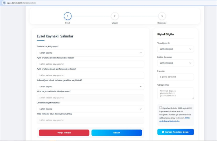 Denizli Büyükşehir Belediyesi’nin güncellediği bu hesaplama aracı, kullanıcıların yaşam tarzlarını analiz ederek karbon salımlarını hesaplamalarına yardımcı oluyor. Ulaşım, enerji tüketimi ve alışveriş gibi günlük alışkanlıkların çevreye etkisini ölçen araç, bireylere karbon salımını azaltmak için pratik öneriler sunuyor.