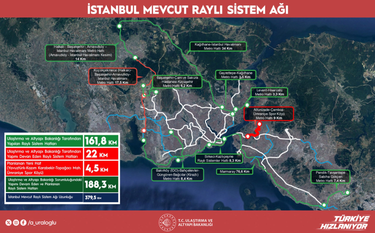 Yavuztürk, Kazım Karabekir, Topağacı Mahallesi ve Ümraniye Spor Köyü olmak üzere 4 yeni istasyonu ile İstanbul’a hayırlı olmasını dileyen Bakan Uraloğlu, Bakanlık tarafından İstanbul’da tamamlanan Raylı Sistem Hat Uzunluğu 161,8 km ve yapımı devam eden raylı sistem hat uzunluğu 26,5 km iken hizmete sunulan hat uzunluğunun ise 188,3 km’ye ulaşacağını sözlerine ekledi.