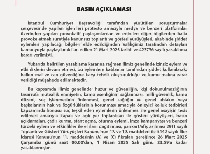 ANKARA (İGFA) – Ankara Valiliği toplantı ve yürüyüş yasağı süresini uzattı. Ankara Valiliği’nin sosyal medya hesabından yapılan...