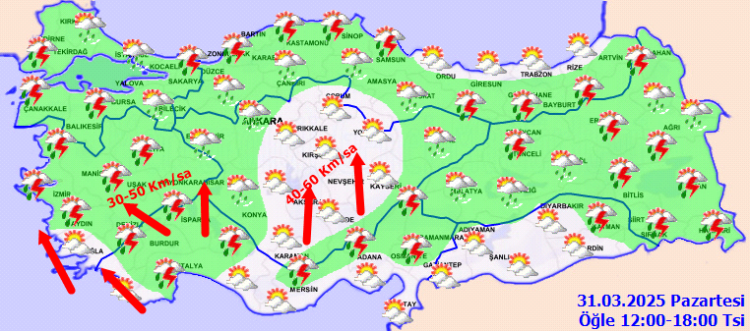 Genellikle rüzgarın güneyli yönlerden hafif, ara sıra orta kuvvette, Güney ve İç Ege, Göller Yöresi, İç Anadolu’nun güneyinde kuvvetli (30-60 km/saat) esmesi beklenirken, Hakkâri çevreleri için yerel kuvvetli yağış ile Güney ve İç Ege, Göller Yöresi, İç Anadolu’nun güneyinde kuvvetli (30-70 km/saat) esmesi beklendiğinden yaşanabilecek olumsuzluklara karşı vatandaşların dikkatli ve tedbirli olması istendi.