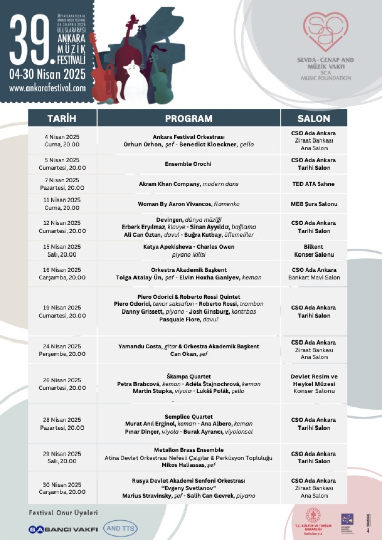 Cenap And anısına gerçekleştirilecek olan 39. Uluslararası Ankara Müzik Festivali’nin açılış konseri, SCA Vakfı’nın ve festivalin iki ilkesi ve geleneğini sürdürüyor. Konser, Türkiye Cumhuriyeti’nin Başkent Ankara’da başlayan çoksesli müzik hareketiyle oluşan sanatsal kapasitesini ortaya koyarken; bu kapsamdaki uluslararası iş birliklerine de örnek oluşturuyor.