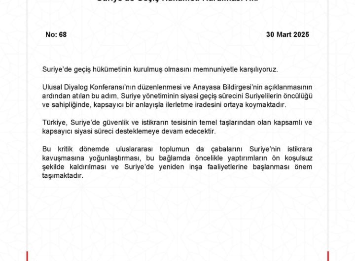 Suriye’de Geçiş Hükümeti Kurulması ile ilgili açıklama yapan Dışişleri Bakanlığı, Ulusal Diyalog Konferansı’nın düzenlenmesi ve Anayasa Bildirgesi’nin...