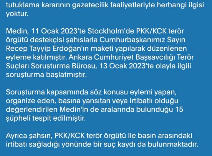 ANKARA (İGFA) – Dagens ETC muhabiri İsveçli Kaj Joakim Medin’in tutuklanmasına ilişkin açıklama İletişim Başkanlığı’ndan geldi. Tutuklama...