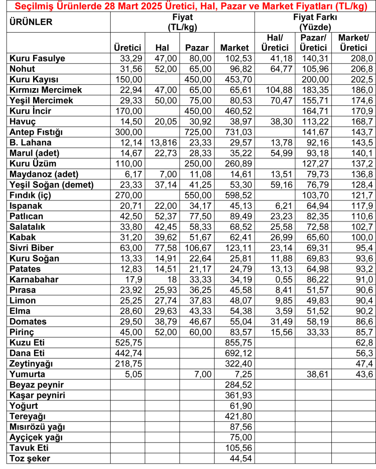 Mart ayında üretici market arasındaki fiyat farkının en fazla yüzde 208 ile kuru fasulyede olduğunu belirten Bayraktar, “Fiyat farkını yüzde 206,8 ile nohut, yüzde 202,5 ile kuru kayısı, yüzde 186 ile kırmızı mercimek, yüzde 174,6 ile yeşil mercimek takip etti. Kuru fasulye ve nohut 3,1 kat, kuru kayısı 3 kat, kırmızı mercimek 2,9 kat, yeşil mercimek 2,7 kat fazlaya satıldı.