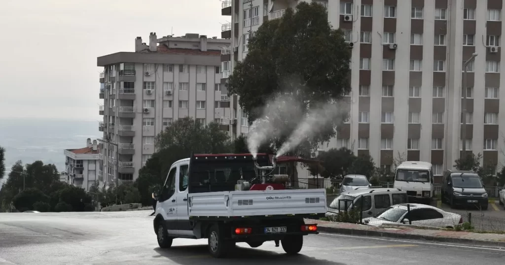 İZMİR (İGFA) – İzmir’in Çiğli ilçesinde belediye ekipleri, periyodik olarak yürüttükleri program kapsamında parklar, bahçeler, yeşil alanlar ve su birikintileri gibi sivrisineklerin üreme alanlarına çevre dostu ilaçlama yöntemleriyle müdahale ediyor.