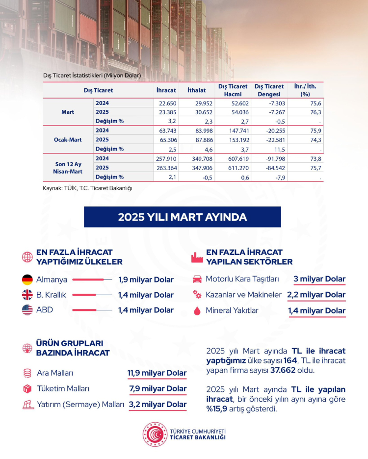 Mart ayında ihracat, geçen yılın aynı ayına göre yüzde 3,2 artarak 23 milyar 385 milyon dolara ulaşırken, ithalat yüzde 2,3 artışla 30 milyar 652 milyon dolar oldu.