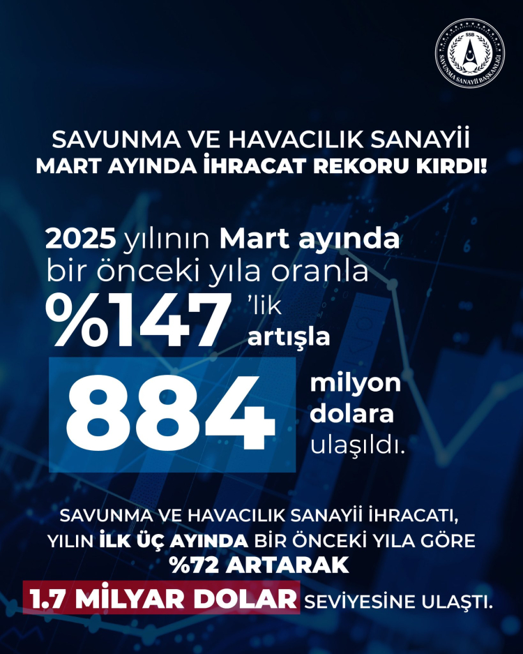 ANKARA (İGFA) – Savunma Sanayii Başkanı Prof. Dr. Haluk Görgün, sosyal medya hesabından yaptığı paylaşımda, savunma ve havacılık ihracatının 2025 Mart’ta geçen yıla göre yüzde 147 artarak 358 milyon dolardan 884 milyon dolara yükseldiğini duyurdu.
