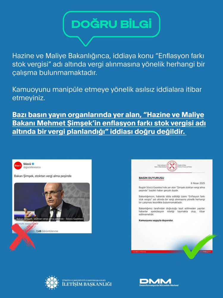 Dezenformasyonla Mücadele Merkezi’nden yapılan yazılı açıklamada, Hazine ve Maliye Bakanlığınca iddiaya konu “Enflasyon farkı stok vergisi” adı altında vergi alınmasına yönelik herhangi bir çalışma bulunmadığının altı çizildi.
